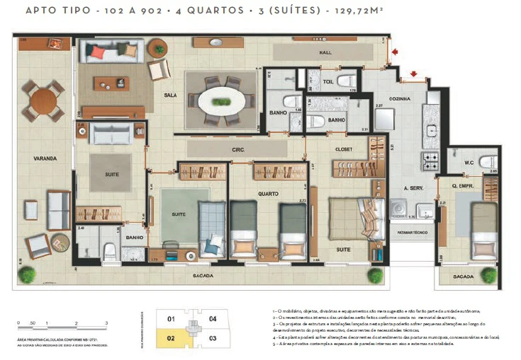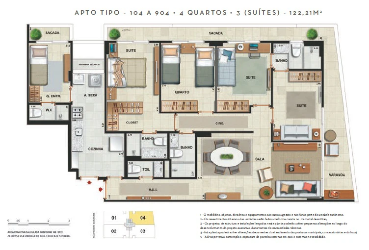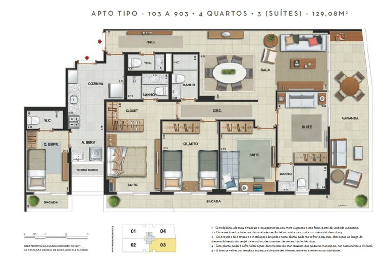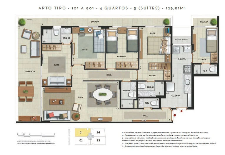 Apartamentos 4 quartos (3 suítes), dependência, 2 vagas, de 122m² a 129m²